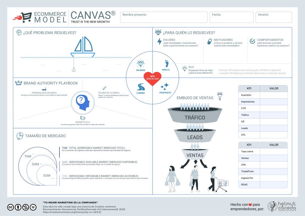 El Ecommerce Model Canvas es un framework abierto que ayuda a emprendedores, dueños de negocio o consultores, a diseñar negocios digitales que conecten con clientes reales, comuniquen una propuesta de valor irresistible y conviertan en ventas. Ideal para idea/MVP/early stage y para quienes necesitan claridad estratégica para encontrar su Product market fit y obtener sus primeras ventas